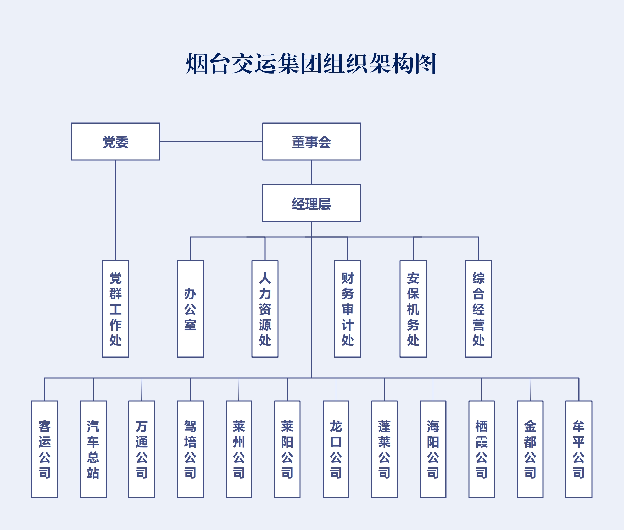 煙臺(tái)交運(yùn)集團(tuán)組織結(jié)構(gòu)模式是以直線職能制為主的經(jīng)營(yíng)管理組織結(jié)構(gòu)。集團(tuán)總部設(shè)黨群工作處、辦公室、人力資源處、財(cái)務(wù)審計(jì)處、安保機(jī)務(wù)處、綜合經(jīng)營(yíng)處,共計(jì)6個(gè)處室。集團(tuán)按經(jīng)營(yíng)轄屬劃分,擁有權(quán)屬企業(yè)12個(gè)、參股企業(yè)4個(gè),分布于煙臺(tái)各縣市區(qū)。